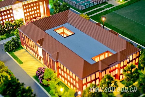 从青岛校区沙盘上看,学生公寓S1-S10的东北角就是可以满足一万名学生就餐需要的食堂