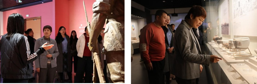 活动伊始,党员们来到曹春生雕塑艺术馆,在讲解员的带领下参观学习。曹春生雕塑艺术馆集中展示了艺术家70余年艺术生涯中创作的多件雕塑作品和素描作品。展览以“为时代而歌”为主题,以“塑魂”“塑史”“塑境”“塑美”为篇章脉络,全面展现了曹春生先生以雕塑艺术讴歌时代、歌颂人民、塑造精神的艺术追求。随后,党员们参观了“文韵齐鲁——山东大学文物考古成果展”。展览集中展示了山东大学近年来在考古发掘与文物保护领域的重大成果,涵盖陶器、青铜器、玉器、石刻、画像砖等多种文物类型,充分体现了齐鲁大地深厚的历史文化底蕴和山东大学在人文社科领域的科研实力。通过参观学习,大家不仅受到了艺术之美的熏陶,也深刻体会到文艺工作者以艺术为人民、为时代服务的初心使命,更是直观感受到中华优秀传统文化的悠久历史与艺术魅力,进一步增强了文化自信与民族自豪感。